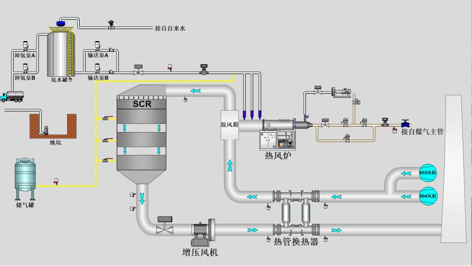 本项目的主要工程内容为:新增1台热管换热器、1台热风炉,1台中温SCR反应塔,1台增加风机,1套氨水储存系统、配套的电气、仪表、土建、烟道、防腐、保温等。